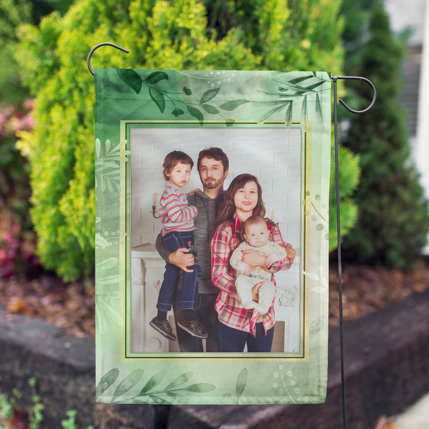A simple yet relaxing photo frame flag design featuring a lush green leaves background.! Upload an image of your choice (of course, abiding by our image guidelines, so that the flag looks good!). Add a custom message of your choice, in your choice of font and color. Complete your order and you will have your own custom flag within days. As personalized flags are printed on demand, please allow 5 days of handling time in addition to our normal shipping estimate in cart.
