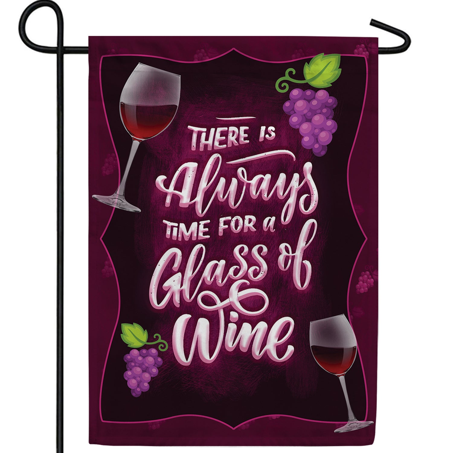 This flag features the phrase "There is Always time for a Glass of Wine" surrounded by wine glasses and grapes on a rich maroon background.