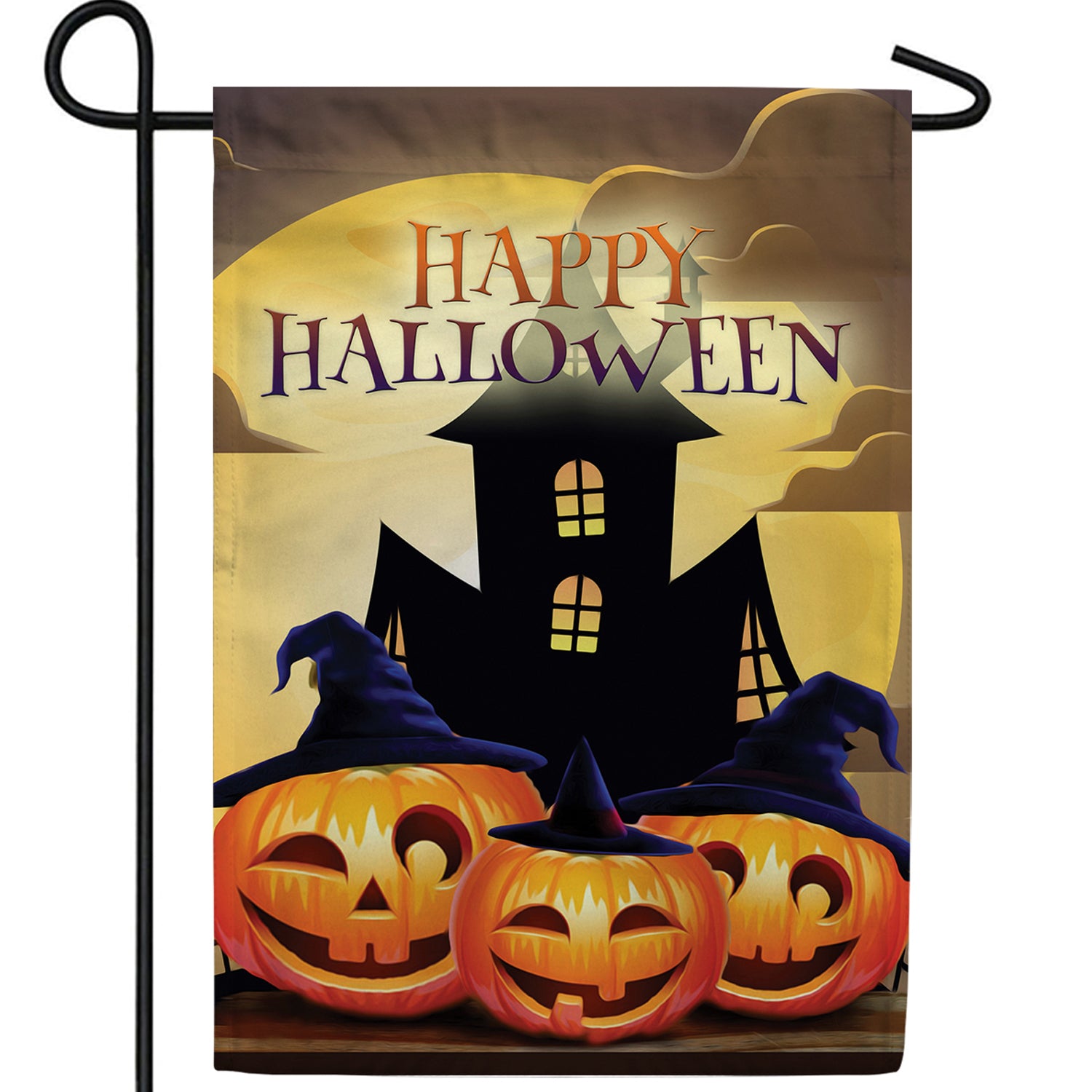 This flag features a trio of Jack o Lanterns each wearing a witch's hat with a creepy castle in the background. "Happy Halloween" is written at the top.