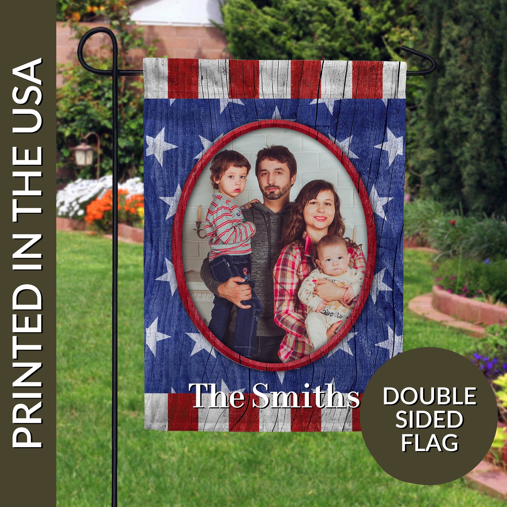A great patriotic design featuring a bright red oval wooden frame with stars and stripes background! Upload an image of your choice (of course, abiding by our image guidelines, so that the flag looks good!). Add a custom message of your choice, in your choice of font and color. Complete your order and you will have your own custom flag within days. As personalized flags are printed on demand, please allow 5 days of handling time in addition to our normal shipping estimate in cart.