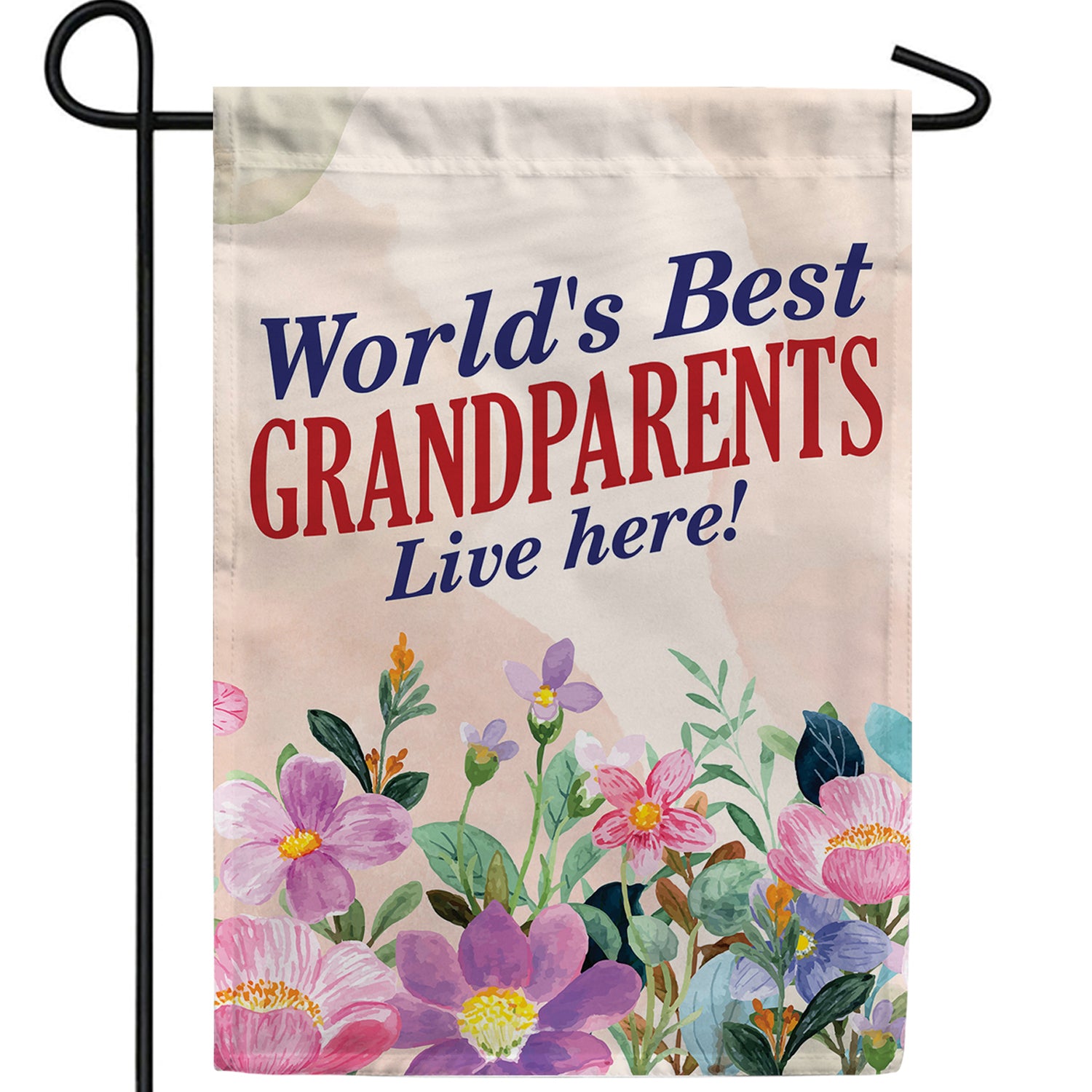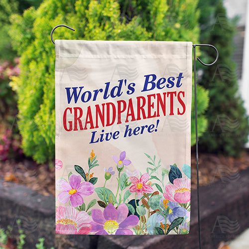 This flag features the phrase "World's Best Grandparents Live Here!" and lovely flowers below it.